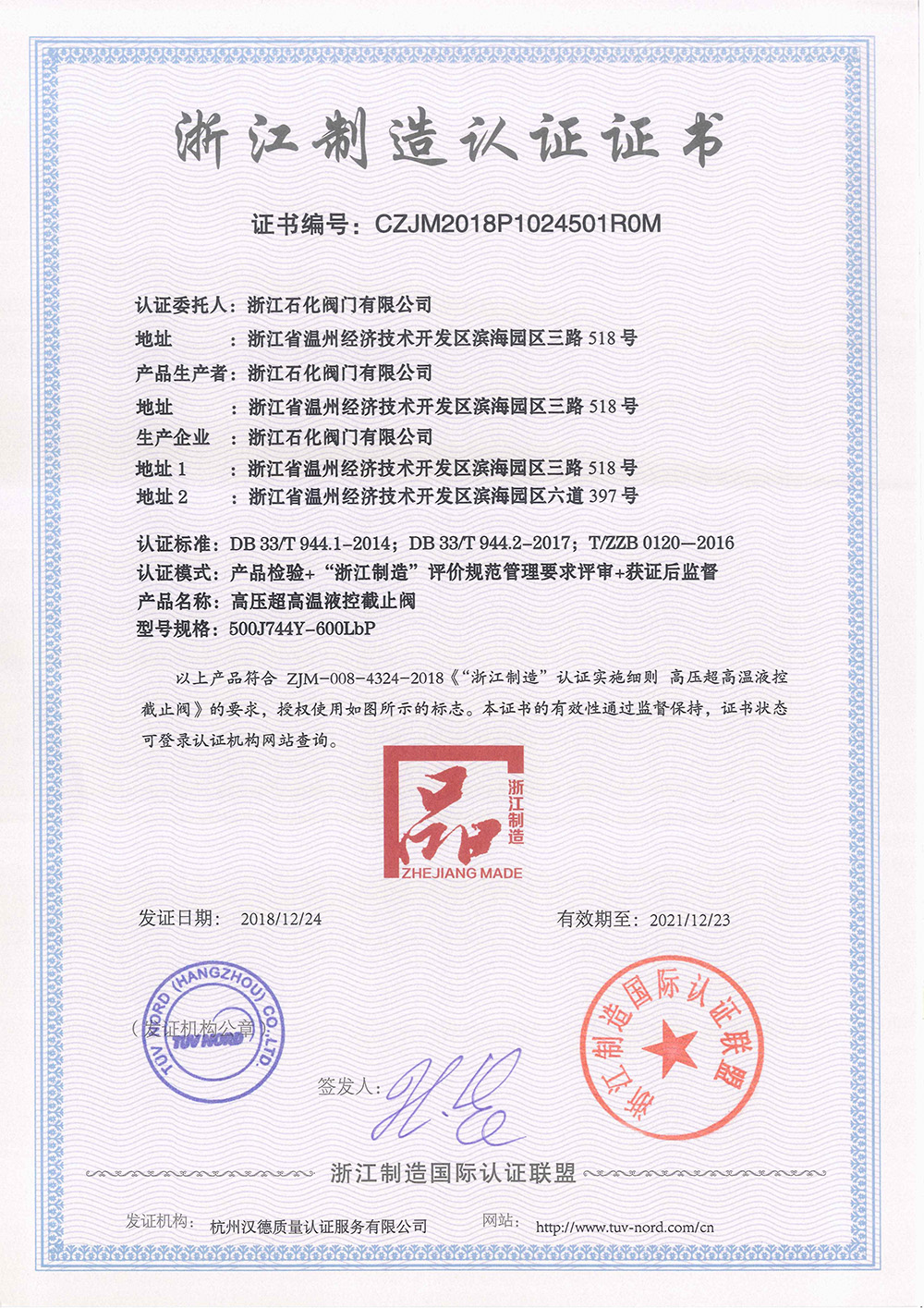 我公司于2018年12月通過了《高壓超高溫液控截止閥》的浙江制造認(rèn)證證書,為了深入推進(jìn)“三強(qiáng)一制造”建設(shè),打響“品字標(biāo)浙江制造”品牌,浙江制造推行了“品字標(biāo)”企業(yè)“四個(gè)百分百”計(jì)劃,努力實(shí)現(xiàn)“品字標(biāo)”企業(yè)廠區(qū)車間100%亮標(biāo)、質(zhì)量承諾100%公示、品牌產(chǎn)品100%貼標(biāo)、廣告宣傳100%植入,以此不斷提升“品字標(biāo)”品牌的社會(huì)知名度、認(rèn)可度和美譽(yù)度。